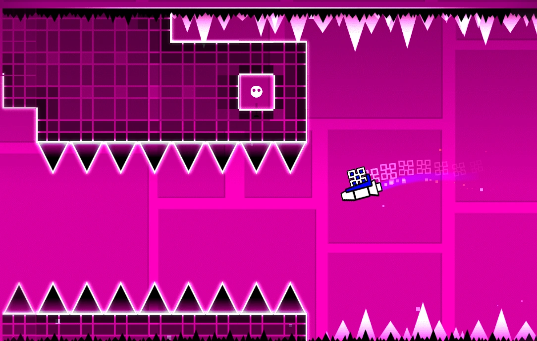 Enfin, une très courte séquence en vaisseau où vous devrez passer entre des pyramides de blocs. Il reste une dernière inversion de gravité avant la fin du niveau, toujours en vaisseau.